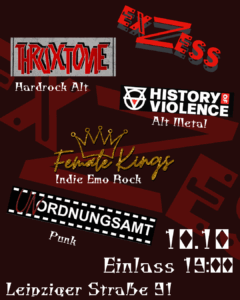 Ein wilder Mix aus Punk, Emo und Metal im bekannten ExZess! Am 10. Oktober finden sich Thruxtone, History of Violence, Female Kings und Unordnungsamt ein, um mit euch den Abend zu rocken! Mit Female Kings ist eine Flinta*-only Band aus Hanau mit dabei, um euch mit Indie Emo Rock in den Bann zu ziehen. Ab 19 Uhr ist Einlass, also kommt in der Leipziger Straße 91 vorbei und macht euch einen starken Abend!